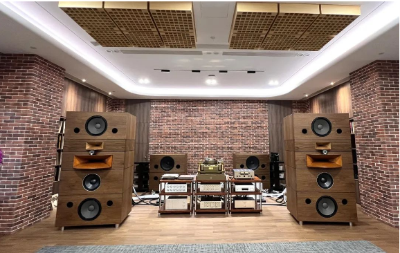 共四套Cello的四件式Performance与Duet 350后级来推动分频系统科普了电子分频常识,再来介绍深圳的超级发烧友郑先生,读者就更能理解他这套超级系统的厉害之处了。来自潮汕的郑先生经营港口物流生意,偌大的办公室就在深圳福永码头边上,工程进行的关系,路边尘土飞扬,但一进到郑先生的办公大楼却是窗明几净,仿若世外桃源。郑先生就在约一百平米的办公室玩音响,单是面积之开阔就让人羡慕不已。应该说整个办公园区都是郑先生的产业,里面包含了办公、会议、私人会所、餐厅等不同用途,郑先生日常主要的工作,即是坐在办公桌后面品茶聆乐,真是神仙不换的生活境界。办公室摆放音响器材的区域,以红砖贴墙,除了天花板几块木制扩散器外,仅有木地板上的一大片地毯,其他很少声学处理,因为面积够大,低频驻波等问题是不存在的。早就实现了财务自由,郑先生可以花大把代价购买世界最顶级的音响系统,但他却想自己动手,打造属于自己风格的声音。那比人还高的积木式结构号角音箱,是委请深圳艺致科技EIZZ负责人钱先生协助设计的,进行四路五分频推动。所谓积木结构是指每个单元都有独立箱体,以厚重的高压板(也就是常说的钢琴响板)制作,可按需求进行上下错位排列。音箱使用的单元清一色为TAD产品,TAD母公司是日本先锋Pioneer,其实1937年Pioneer成立时,主业就是制作音箱与单元,后来才逐渐衍生成多种产品。1970年代时,Pioneer已经是全球首屈一指的音响器材领导者,但高层认为应该重新出发,成立新的公司专门制作“前所未有”的超级音响,TAD于焉诞生。为了追求“世界第一”的目标,TAD的打从一开始就相当大胆,邀请原任JBL副总裁的Bart Locanthi加盟。巨无霸号角音箱以钢琴响板制作,每个单元都有独立单元,积木结构可以任意排列组合