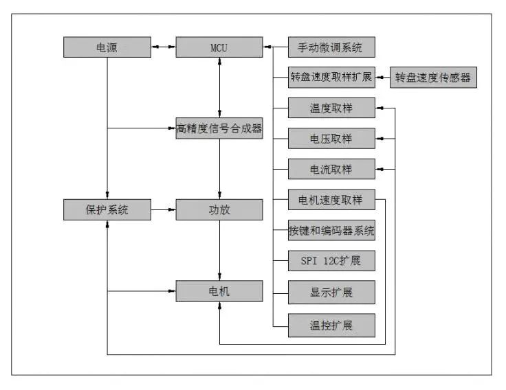 ◎控制策略 众所周之,从黑胶唱盘的负载特性来讲,它属于典型的惯量系统,对于直接负载的变化本身有一定的抑制能力(比如唱针与唱片摩擦带来的负载波动),因此,控制系统调节器的核心和重点为系统的稳态精度,但对于机械末端产生的耦合振动和机械结构产生的谐振,它又及其敏感,此时又需要控制系统的调节器具备快速的动态性能。在传统的黑胶唱盘产品中,抑制外界扰动的处理方式往往是完全通过繁琐复杂的机械避震来处理。通过无数次的实测数据,EIZZ提出了新的设想,即除去机械结构的优化避震方式之外,还希望通过电气驱动控制的调节作用,参与到系统避震控制中,采用驱动控制系统和机械避震的复合方式,达到动态与稳态的统一性能,还原最本色的听感。经过几年的技术探索,采用了如下框图的驱动系统方案控制流程:◎驱动控制 系统控制流程介绍 本方案为基于微处理器的交流同步伺服双闭环控制(外环速度环,内环转矩环)+直接转差补偿系统,控制流程如下:
