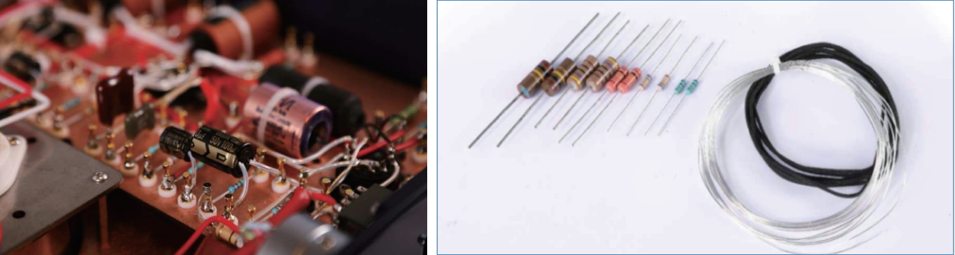 放大电路全部手工搭棚,紫铜底板屏蔽,纯银连接线,铁氟龙绝缘搭棚端子,全部顶端丹麦DUELUND电容搭配英国AUDIO NOTE银膜音频电容,日本碳膜电阻等